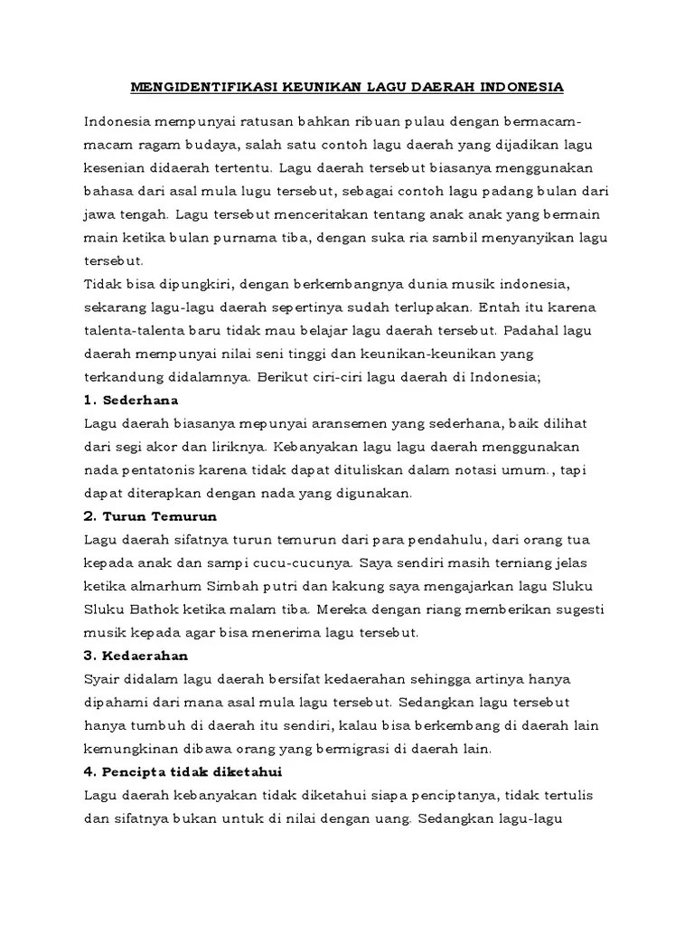 Ciri utamanya ialah menggunakan bahasa daerah, mengandung makna tertentu untuk masyarakat sekitar serta alunan iramanya yang sederhana. Lagu ini diubah liriknya menjadi 'garuda di dadaku untuk memberikan semangat kepada tim sepakbola indonesia. Sejumlah rumah warga karawang rusak ringan hingga berat akibat angin kencang. Hewan ini mempunyai habitat utama di atas pohon, dengan bertengger. 27.05.2021 · lagu daerah merupakan lagu yang dihasilkan dari nilai kebudayaan wilayah setempat.